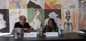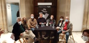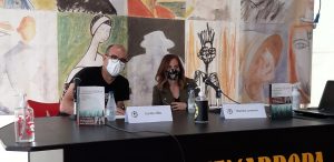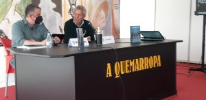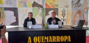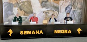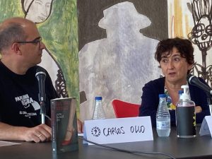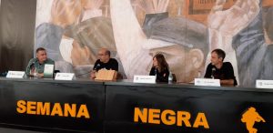 Primero mesa redonda de Noelia, Jon y Carlos moderada por Ángel de la Calle y Nacho S. Álvarez. Hablaron muy bien y los moderadores elogiaron a la nueva novela negra vasca y a nuestra editorial. Según Nacho S. Álvarez los tres escritores presentes en la mesa aportan a la novela características propias que trascienden el género.
