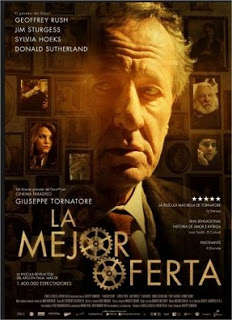Bueno, la película, que es a lo que íbamos. Virgil Oldman (Geoffrey Rush) es un atildado (qué palabra más bonita, ¿no? Es onomatopéyica)  tasador y subastador de obras de arte y antigüedades que vive rodeado de riqueza y soledad. Un día recibe el encargo de valorar el contenido de una mansión llena de objetos valiosos, pero en absoluta decadencia. La dueña es una mujer misteriosa que no se deja ver. Sufre una enfermedad que le lleva a rehuir todo  contacto humano y solo se comunica con el señor Oldman por teléfono o través de una grieta en la puerta de su cuarto. ( Inciso, la voz misteriosa es la de la que dobla a Natalie Portman y cuando luego aparece Sylvia Hoeks, te desconcierta). El hombre se siente cada vez más intrigado por la dueña de la casa y unas misteriosas piezas que van apareciendo por el suelo y que son partes de un famoso autómata de 1800. A partir de ahí se desarrolla una trama de amor e intriga que no os voy a reventar. Geoffrey Rush está maravilloso y la película es elegante, misteriosa y larga. Le sobra media hora, la gente no es amiga del resumen, pero yo sí. Con todo, merece la pena y le vamos a dar