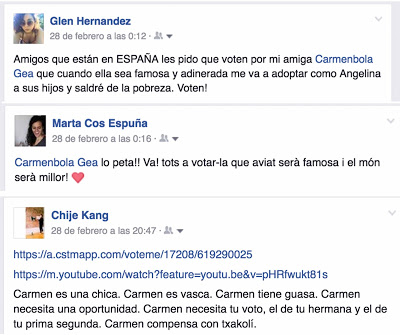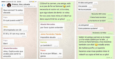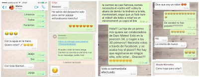 Aplauso para mi madre first, que ni la de la Pantoja, vaya... Consiguió que su residente de enfermería (la cuál está haciendo muchos puntos) les pidiera que me votaran a unos amigos en un cumple al que iba por la tarde. Destacable también la turra que dieron Cris, Marina y Yaiza, entre otras, a todos sus contactos.