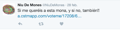 Aun así, repito que estoy feliz feliz de haberme atrevido. Es la típica cosa que pienso en hacer pero nunca me decido. Se ve que ne general, os ha gustado. Y os animo a que os presentéis a todo lo que os apetezca, mi voto y el de mi madre ya los tenéis.