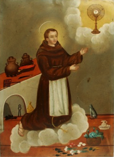 Por lo visto fue un niño tímido y bueno y desde muy joven comenzó a trabajar de pastor. Yo creo que es la derecha si quieres que un hijo sea santo: meterlo a pastor. Entre la cantidad de veces que se les aparece la Virgen (no me extraña, con lo aburridos que estarían los chiquillos, que vieran cualquier cosa). Además, si la alternativa a cuidar ovejas es irse a un convento, hasta yo me hubiera ido. Quieras que no, por sosas que fueran las otras monjas algo más de conversación que el rebaño ya darían. Bueno, que el hombre se hizo franciscano y lo que más me gusta es que sus misiones en el convento fueran ser refitolero y limosnero. ¡Qué maravilla! No sabía que existiera el cargo de refitolero en los conventos, parece que era el que se ocupaba del refectorio, pero yo me lo imagino chafardeando sin parar. Por lo visto también hizo algún milagro: multiplicar panes, sacar agua de una piedra, tener una visión de Jesucristo... Vamos, lo normal. Es el patrón de los congresos eucarísticos (vaya sosada)y de las cocinas y fogones, donde previene los accidentes (mucho más refitolero y bonito).