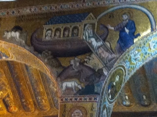Qué alegría para mi santoral de las monas. Son Santa Olivia, Santa Rosalía, Santa Cristina y Santa Ninfa (para mí que esta se la han inventado, pero investigaré). Religiosos lo son un rato, la ciudad está llena de hornacinas con santos y además preconciliares, pero del concilio de Trento. Yendo vestida como indica la foto, me hicieron ponerme una capelina de papel para entrar a ver la Capilla Palatina. No me tuve que comprar mantilla de milagro. Hay que reconocer que la capilla vale la pena, mucho más que el palacio. Está dedicada a San Pedro y San Pablo y llena de mosaicos muy bien conservados.